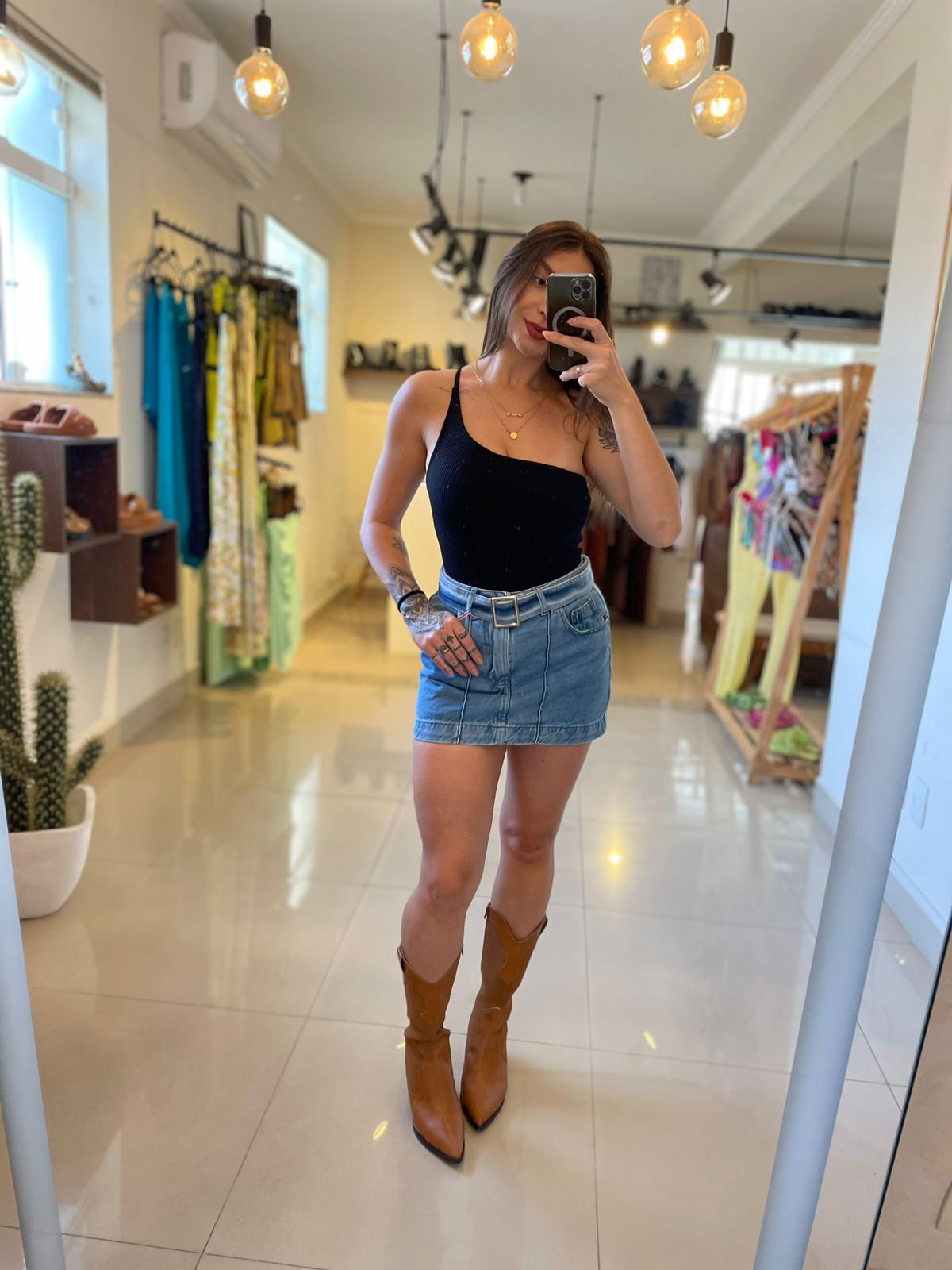 Estilosa e prática, a saia jeans curta com cinto é a peça perfeita para produções modernas e casuais. O tecido jeans garante durabilidade e ótimo caimento, enquanto o cinto adiciona um detalhe fashion que valoriza a cintura e completa o look. Ideal para combinar com camisetas, blusas ou croppeds, criando composições versáteis e cheias de personalidade.