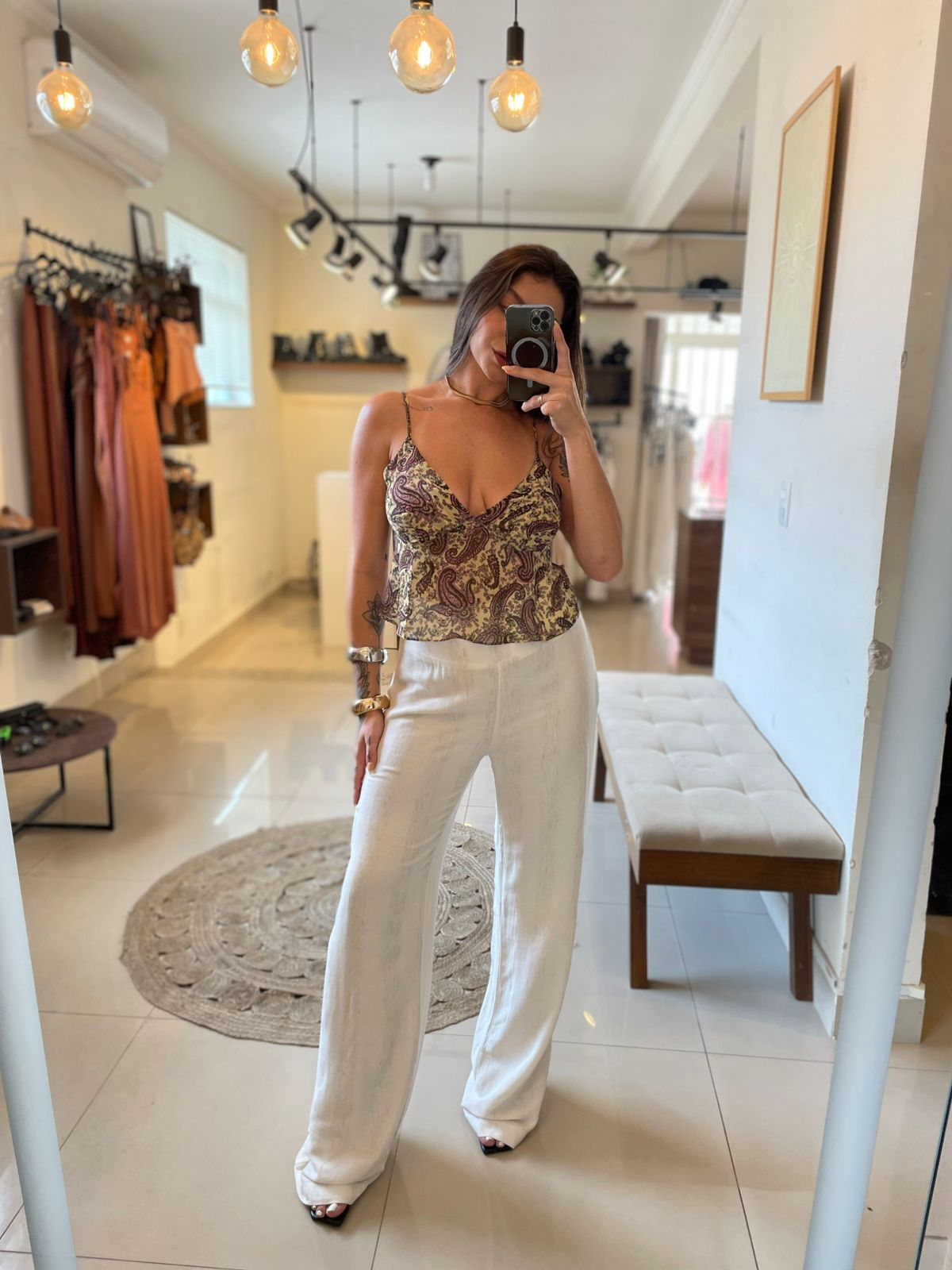 Calça de cós largo com caimento solto, proporcionando conforto e estilo. A modelagem moderna valoriza diferentes tipos de corpo, sendo versátil para looks casuais ou sofisticados. Pode ser combinada com blusas justas ou soltinhas, criando um equilíbrio elegante.