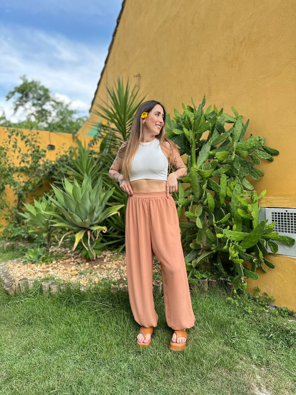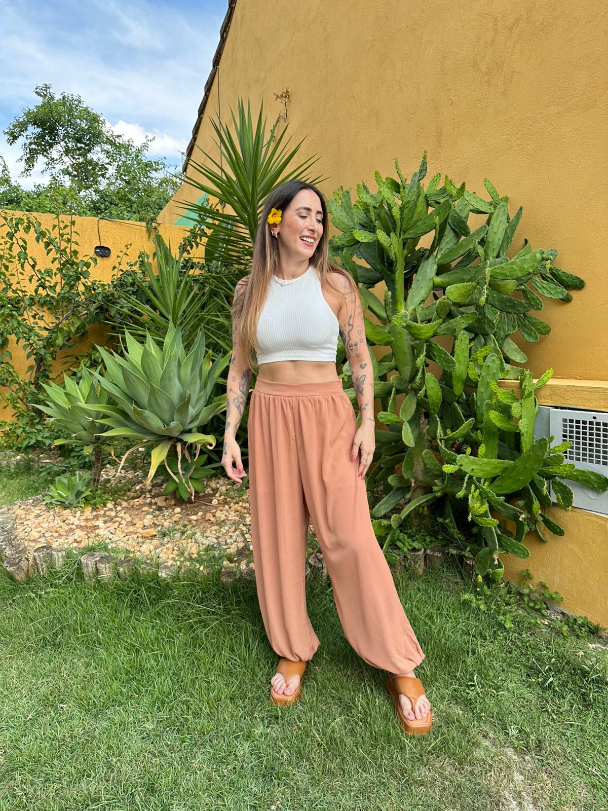 A calça Aladdin é sinônimo de conforto e estilo com um toque boho. Com sua modelagem ampla e caimento leve, ela oferece liberdade de movimento e um visual despojado, perfeito para compor looks casuais, festivais ou momentos de bem-estar. O cós ajustável e o volume característico nas pernas trazem um charme diferenciado e moderno à peça.