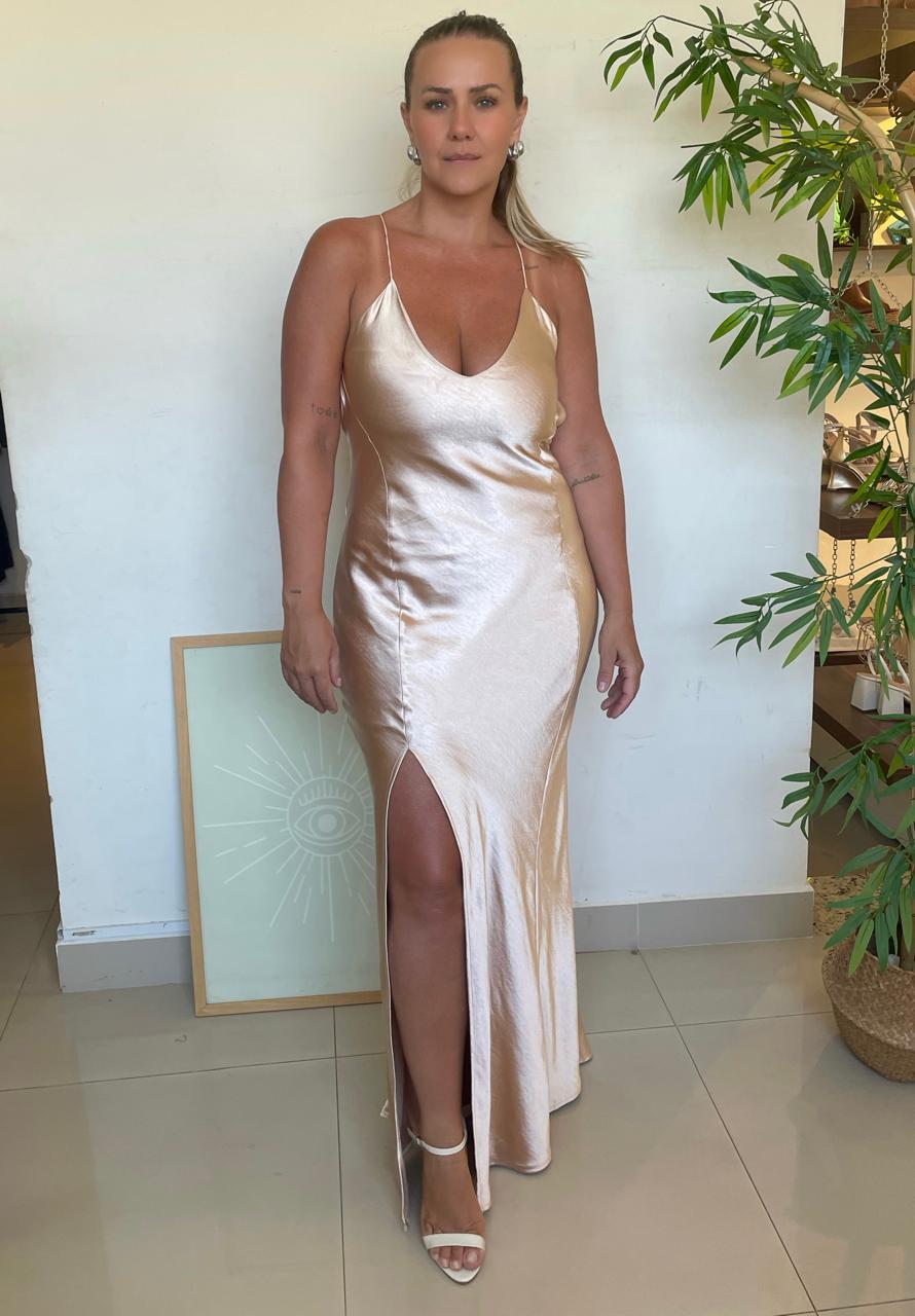O vestido longo em cetim dourado é puro impacto e elegância. Com acabamento acetinado que reflete a luz de forma sofisticada, a peça chama atenção em qualquer ocasião. O super decote nas costas traz sensualidade e modernidade ao visual, equilibrando o comprimento longo com um design marcante e atual. Com caimento fluido e toque suave, é a escolha ideal para eventos noturnos, festas e produções glamourosas que pedem protagonismo.