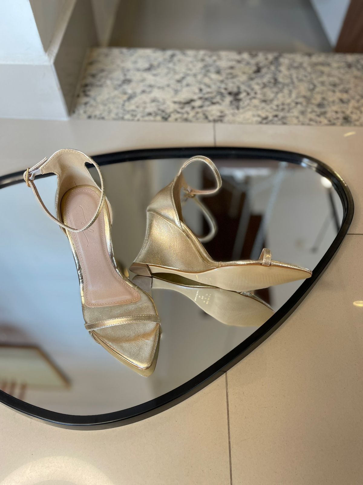 Sapato tendência que traduz delicadeza e sofisticação em cada detalhe. Com acabamento metalizado dourado suave, ele traz um brilho elegante e atemporal, perfeito para iluminar produções sem perder a leveza. O design de bico fino alonga a silhueta, enquanto o salto anabela baixo garante conforto e estabilidade para o uso ao longo do dia ou da noite.