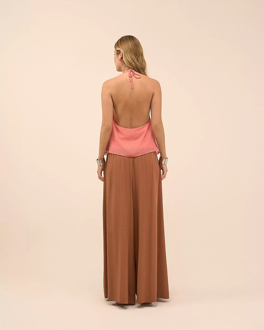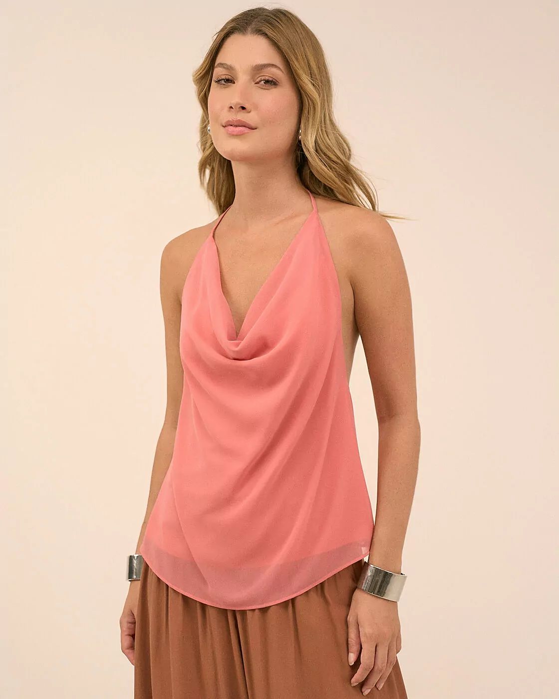 Blusa frente única degagê na cor rosé, elegante e feminina. O decote degagê cria um efeito drapeado sofisticado, valorizando o colo com delicadeza, enquanto o modelo frente única destaca os ombros e traz charme ao visual. Com caimento leve, é ideal para composições modernas e refinadas, perfeitas para ocasiões especiais ou produções mais fashionistas.