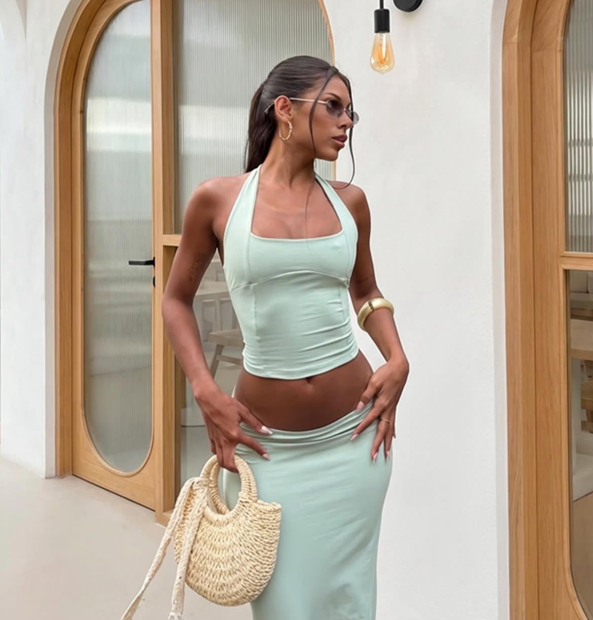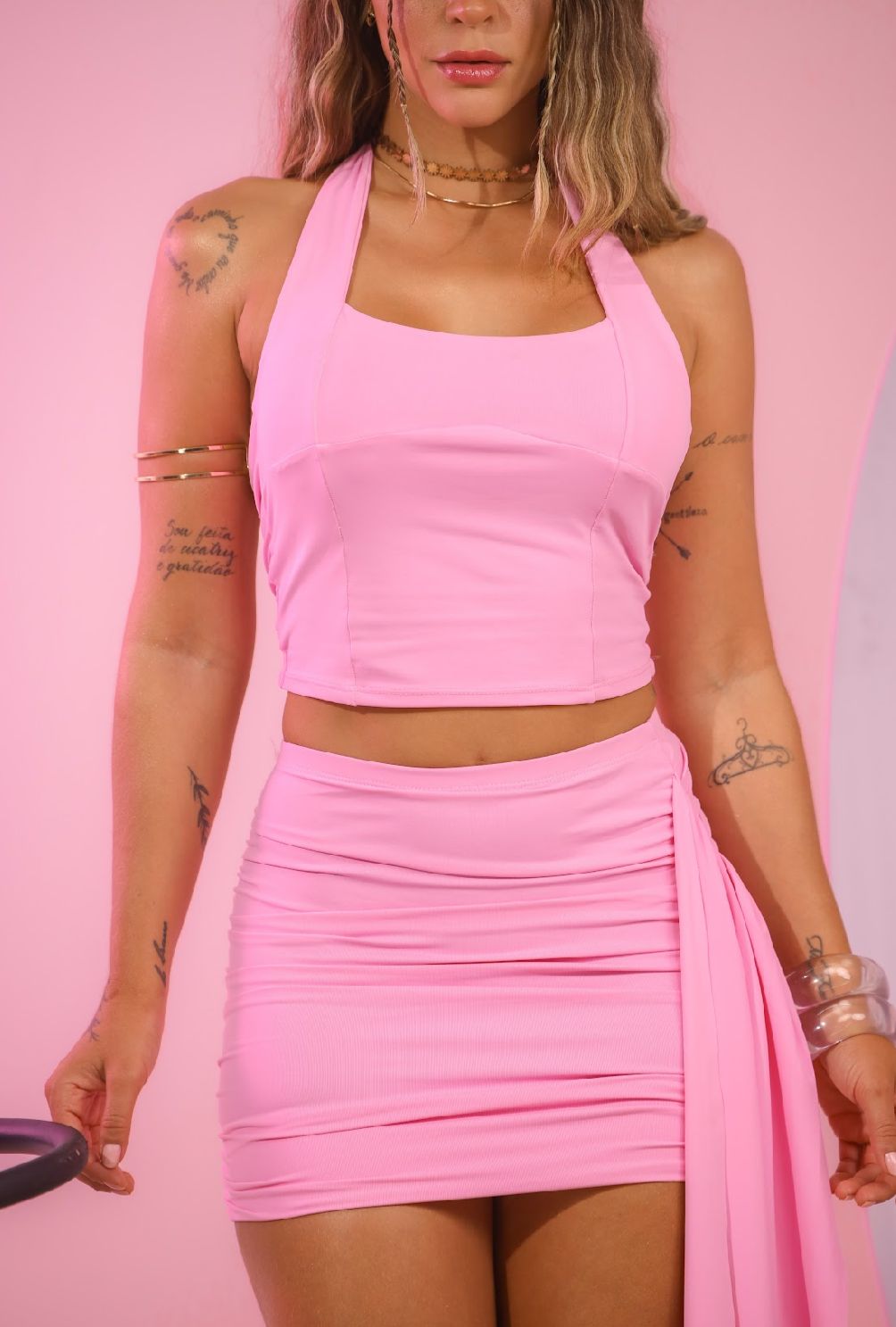 Cropped confeccionado em tecido poliamida, com toque macio, elasticidade e excelente caimento. Possui modelagem ajustada ao corpo e detalhe no fechamento atrás, proporcionando conforto e valorização do busto com decote. Peça versátil, ideal para compor looks modernos