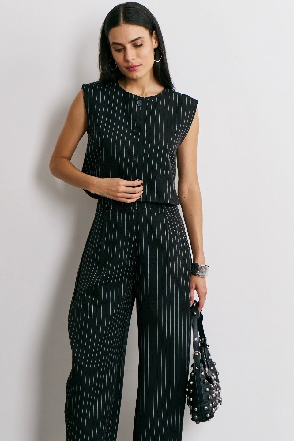 Colete de alfaiataria com estampa risca de giz, clássico e elegante. A modelagem estruturada garante um caimento impecável, enquanto a risca de giz traz sofisticação e um toque atemporal ao visual. Versátil, pode ser usado sozinho ou em sobreposição, compondo looks modernos e refinados, do trabalho a produções fashionistas.