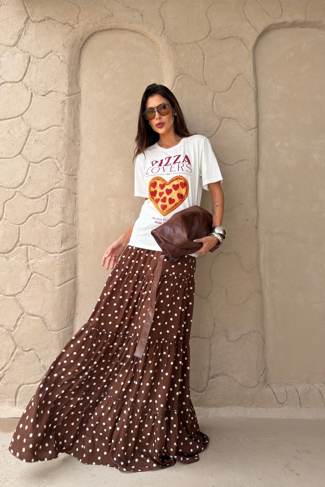 Porque é leve, feminina e cheia de movimento. A Saia Longa Poá Blair une tecido fresco, babados que valorizam o caimento e uma modelagem confortável, criando um visual fluido e atual. É o tipo de peça que traz charme imediato ao look e funciona em diferentes propostas, do casual ao mais elaborado.