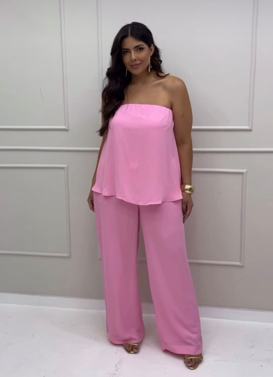 Elegante e versátil, o conjunto plus size composto por blusa tomara que caia e calça pantalona é a escolha perfeita para quem busca conforto aliado a um visual sofisticado. A blusa valoriza o colo e o busto, enquanto a calça pantalona proporciona fluidez e alonga a silhueta, garantindo um caimento harmonioso.
